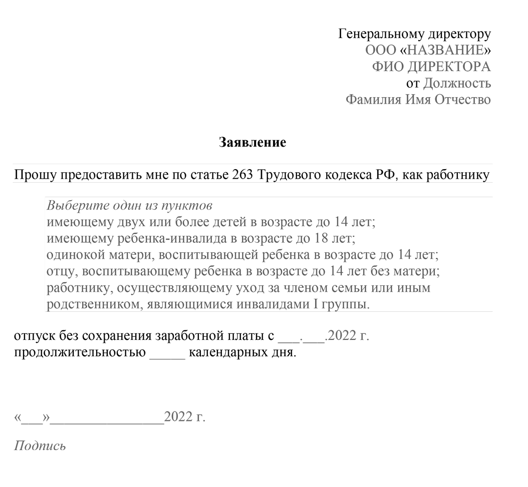 Заявление на отпуск за свой счет родителям с детьми